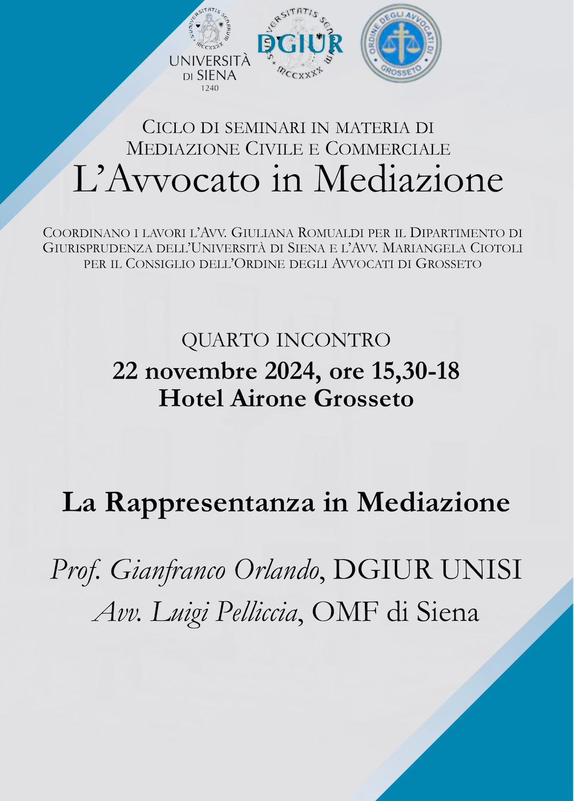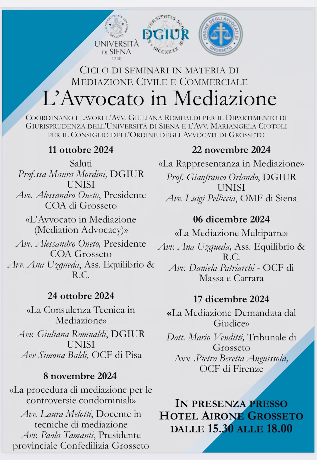 Si ricorda, per chi avesse interesse, che prosegue il Seminario “L’Avvocato in mediazione” organizzato da COA GR ed UNI SI, e rivolto non solo ai Mediatori, ma anche a tutti i Colleghi che gradissero approfondire la tematica della mediazione.
